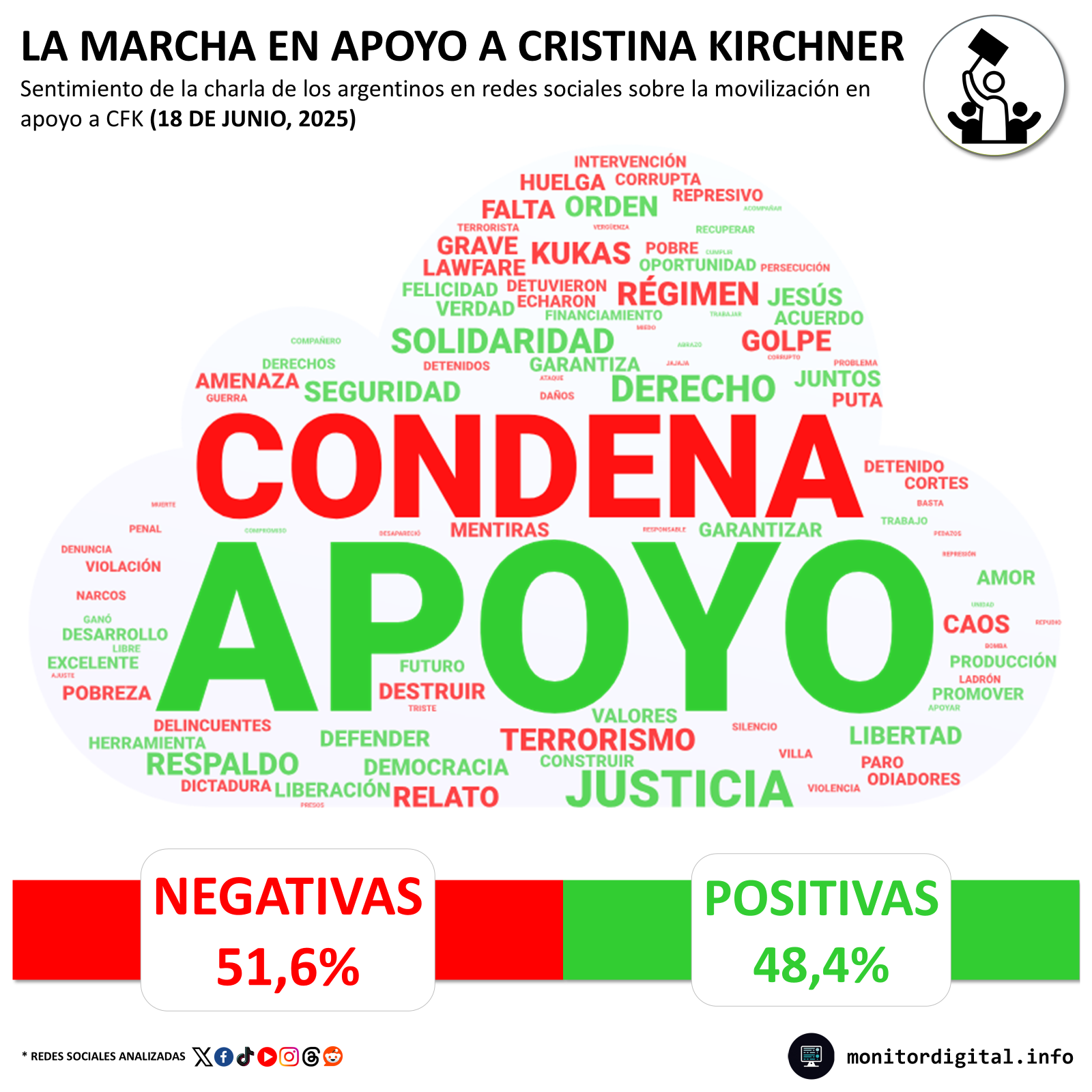 En cuanto al sentimiento de las menciones en redes sociales durante la marcha de respaldo a Cristina Kirchner, la negatividad se impuso por poco margen a la positividad.