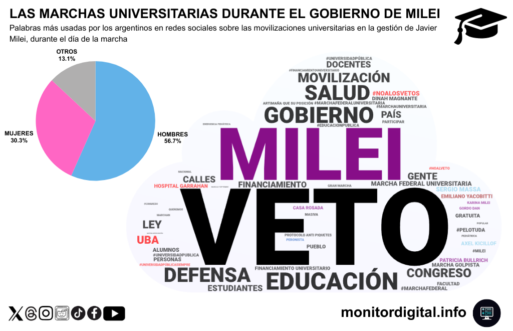 En términos de género, el 56,7% de las interacciones provinieron de hombres, 30,3% de mujeres y 13,1% de otros, manteniendo la sobrerrepresentación masculina habitual en la conversación política digital.