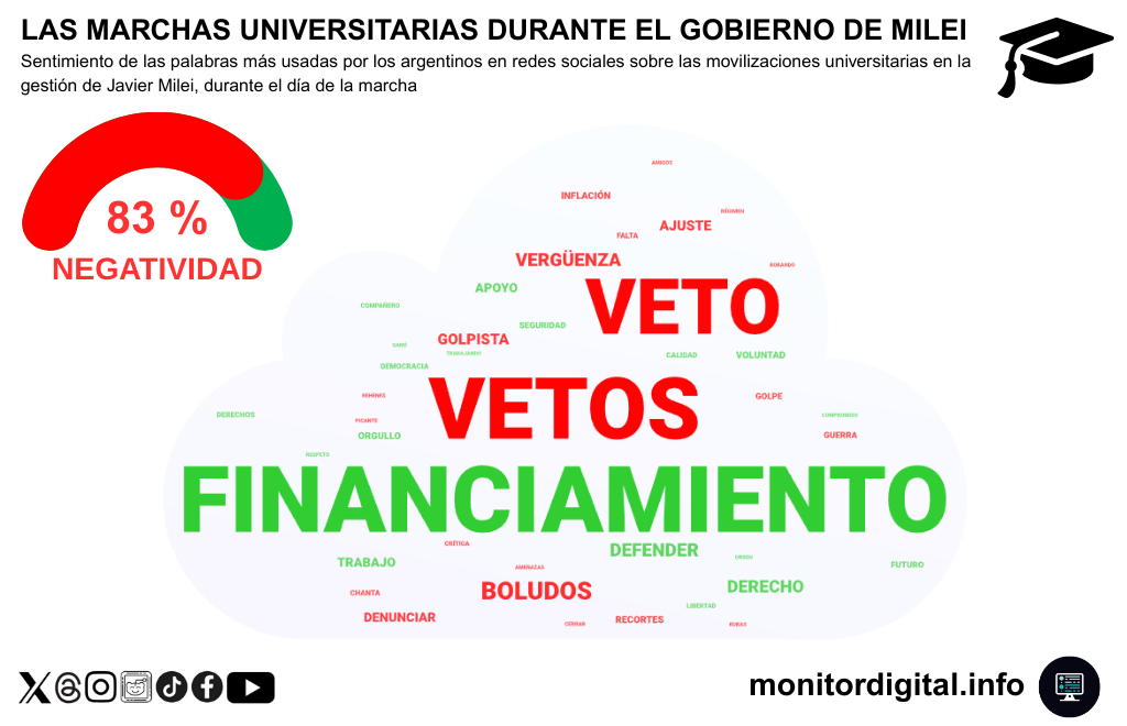 Las menciones más recurrentes asociadas a esta carga fueron “veto”, “vergüenza”, “recortes”, “ajuste” y “golpista”.