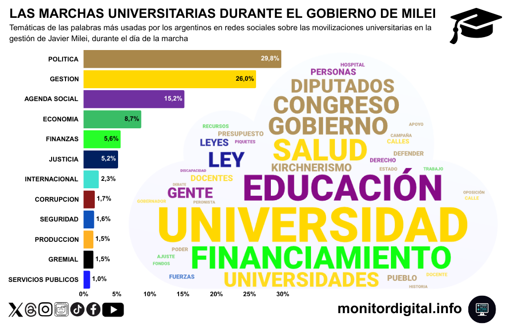 La conversación refleja el pasaje de un reclamo inicialmente transversal y ciudadano hacia una agenda más sectorizada, dominada por actores universitarios y opositores.