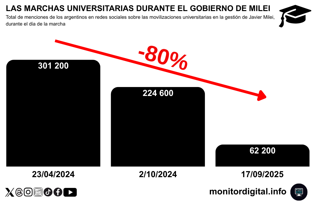 Menor interés que la primera (-25%). El reclamo seguía vigente, pero con menos masividad y mayor circunscripción a comunidades universitarias y opositoras. El clima fue algo menos hostil. - 17/09/2025: 62.200 menciones / NSR -68