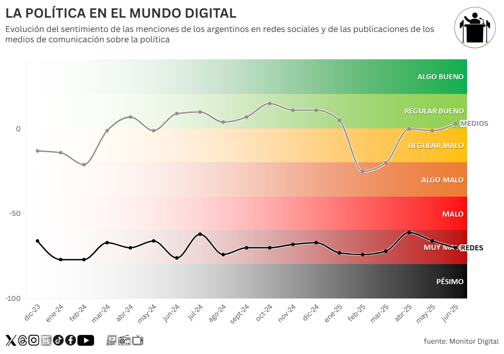 En el análisis de la evolución del sentimiento de la conversación de los argentinos sobre la política, el primer rasgo que resalta a simple vista es la disonancia persistente entre el tono de la cobertura mediática (línea gris) y la percepción social expresada en redes (línea negra).