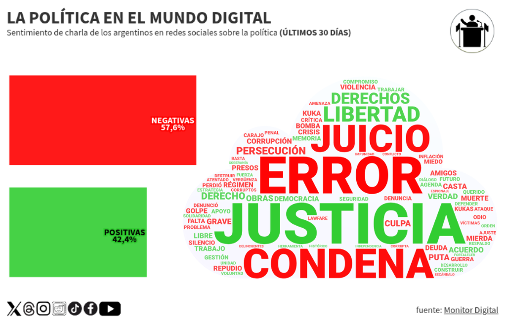 Con el 57,6% de negatividad y 42,4% de positividad, en la conversación pública impera un clima de descontento generalizado sobre la política, fuertemente atravesado por emociones adversas como enojo, desconfianza, frustración o indignación.