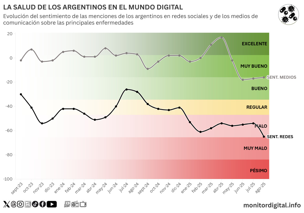- El promedio global de sentimiento de la charla argentina en redes sociales sobre la salud es negativo (-58), con caídas profundas en casi todas las enfermedades analizadas.