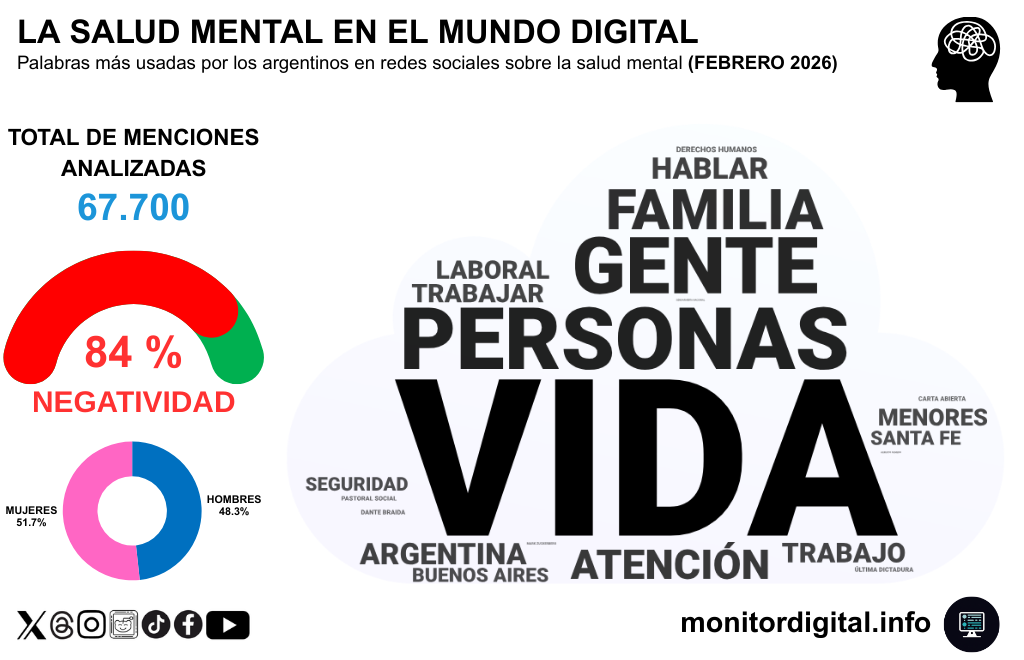 En febrero de 2026, la conversación sobre salud mental reunió 67.700 menciones analizadas y mostró una distribución por género equilibrada: 51,7% mujeres y 48,3% hombres.