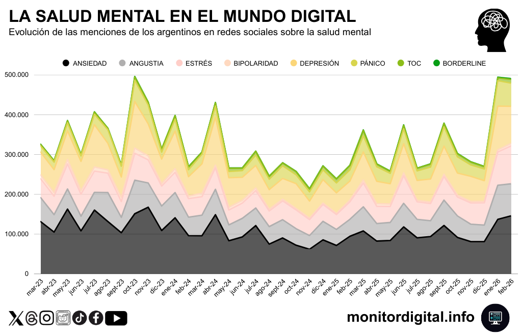 Este patrón se reafirma por el hecho de que el salto de menciones se registró en varias categorías de conversación sobre la salud mental: ansiedad, angustia, estrés, depresión y pánico subieron en simultáneo.