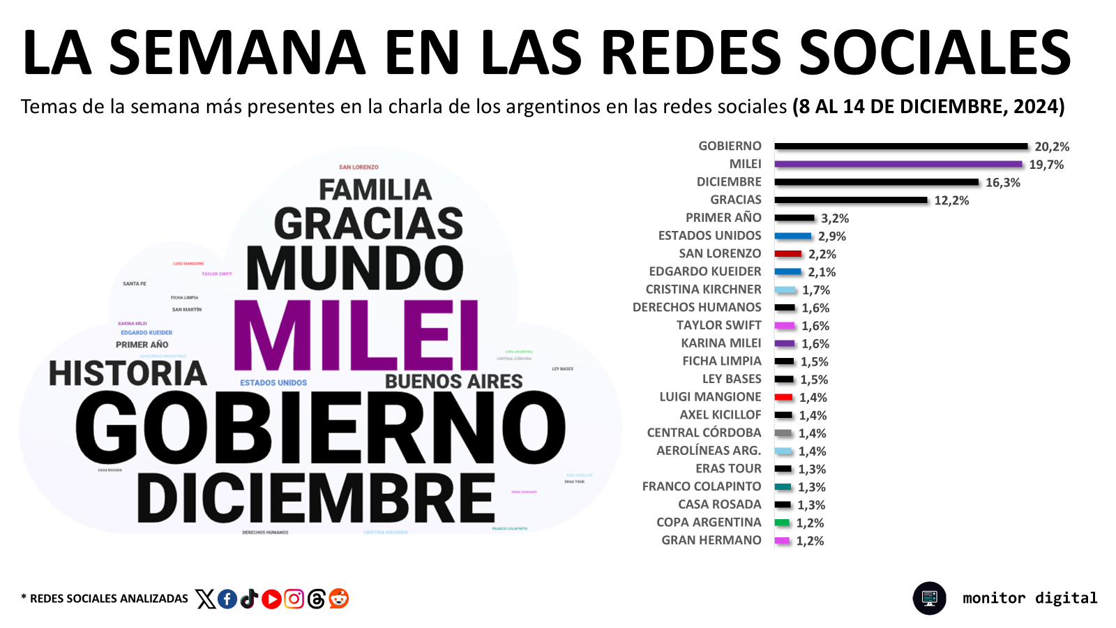 La semana en las redes volvió a tener a Javier Milei como protagonista central de la narrativa digital de los los argentinos, fenómeno traccionado en los últimos días por las publicaciones relacionadas con el primer año de su gobierno.