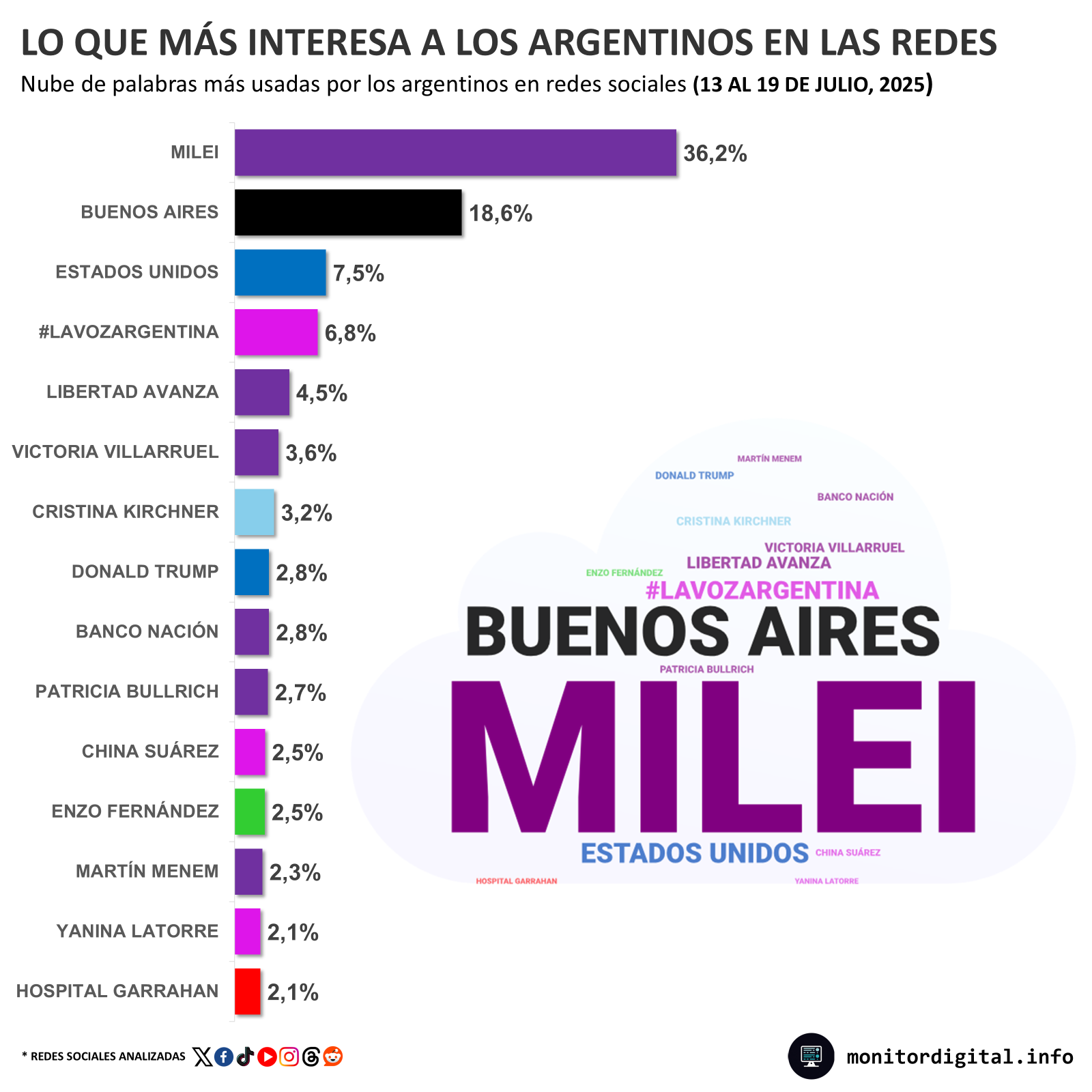 La relación de la Argentina con los Estados Unidos ocupó un segundo lugar de atención, mientras que "La Voz Argentina" sigue generando gran atractivo en la charla digital.