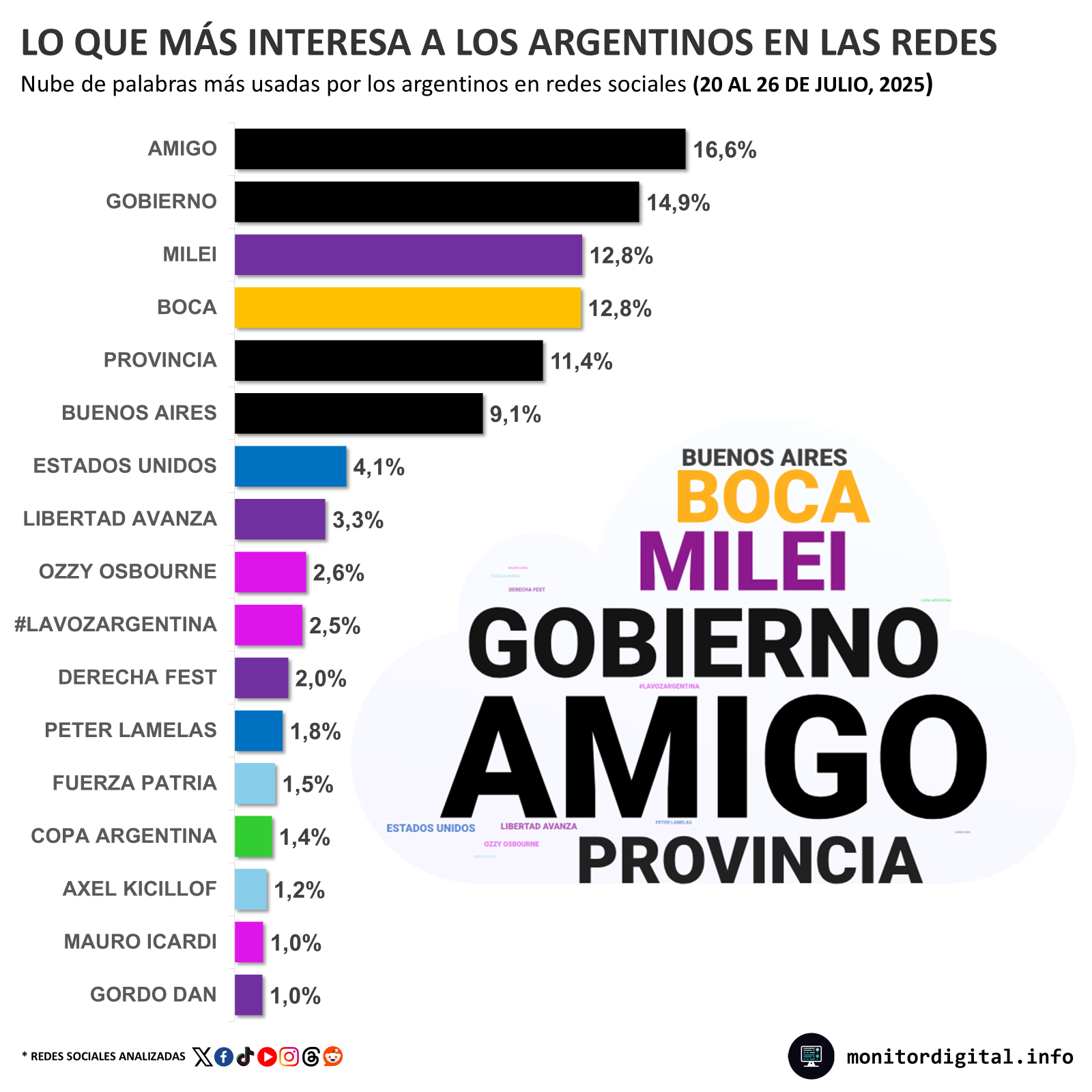 Con menos interés, la relación entre la Argentina y los Estados Unidos quedó en cuarto orden, mientras que la muerte de Ozzy Osbourne y los escándalos en torno a Mauro Icardi también lograron su lugar en el debate de las redes.