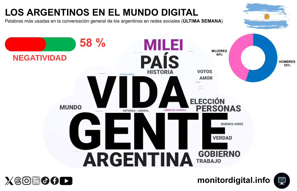 La conversación digital de la última semana en redes sociales argentinas se mantuvo intensa, con un 58% de menciones negativas, indicador que confirma la persistencia de un humor social cargado de malestar y desconfianza.