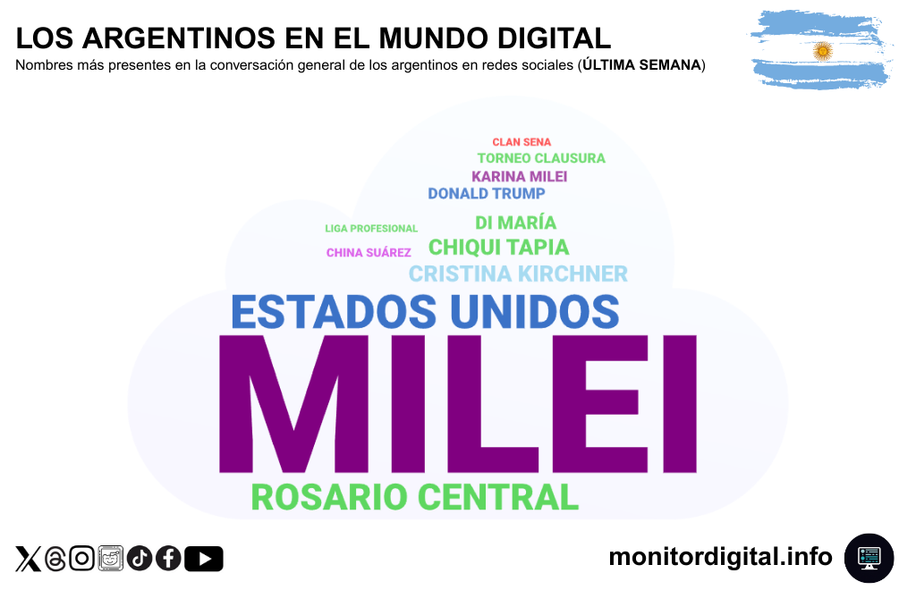 La nube de nombres deja en claro que el gran protagonista de la conversación digital de la semana es Javier Milei.