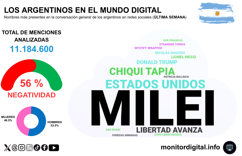 Más de 11,1 millones de menciones y un clima con 56% de negatividad marcan una conversación tensa, con paridad de voces entre varones y mujeres.