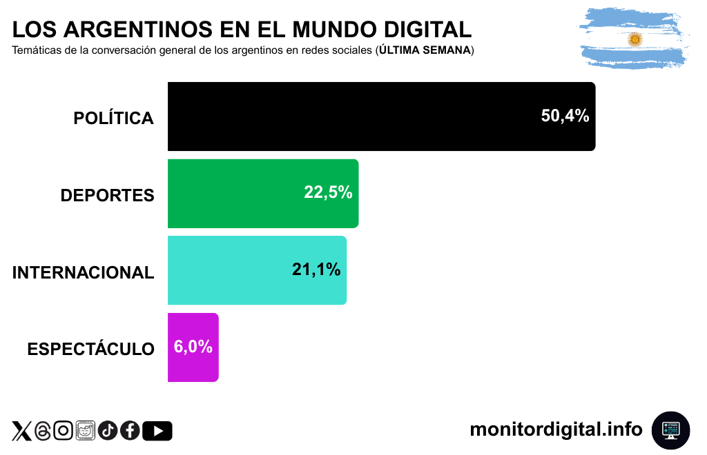 La mitad del diálogo se concentra en política (50,4%), mientras deportes (22,5%) y agenda internacional (21,1%) empujan el resto.