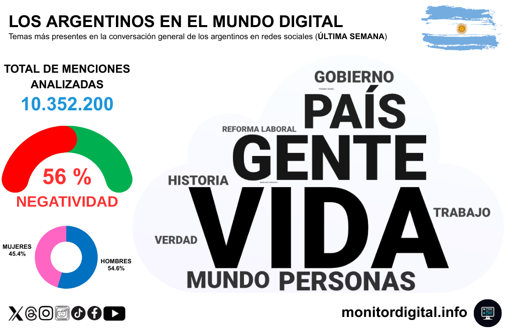 El volumen llegó a 10.352.200 menciones y el clima general sostuvo 56% de negatividad, con una participación de 54,6% hombres y 45,4% mujeres.