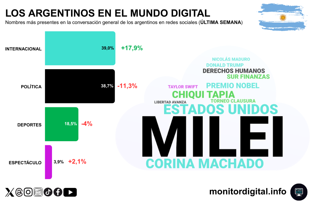El ranking de nombres más presentes en la conversación de los argentinas durante la última semana en las redes sociales confirmó el doble comando de la semana: agenda local intensa y agenda internacional en expansión.