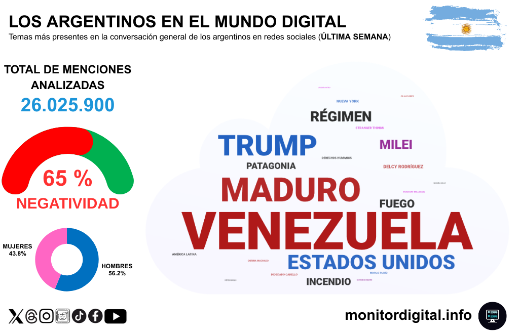 En paralelo, las redes argentinas tradujeron el conflicto a idioma local: “Argentina” (2669) y “Milei” (1238) más “Javier Milei” (513) marcaron que el debate no se limitó a Venezuela, sino que activó una discusión sobre alineamientos, soberanía y modelo político.