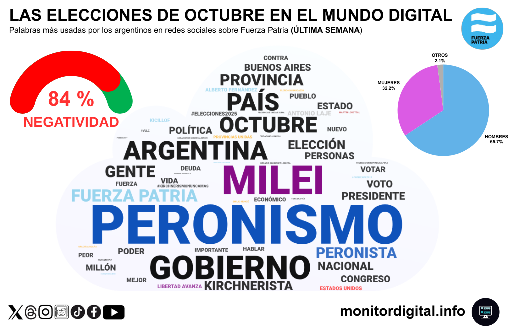 La conversación sobre Fuerza Patria se desarrolla en un entorno de 84% de menciones negativas, el índice más alto de las tres fuerzas analizadas en detalle.