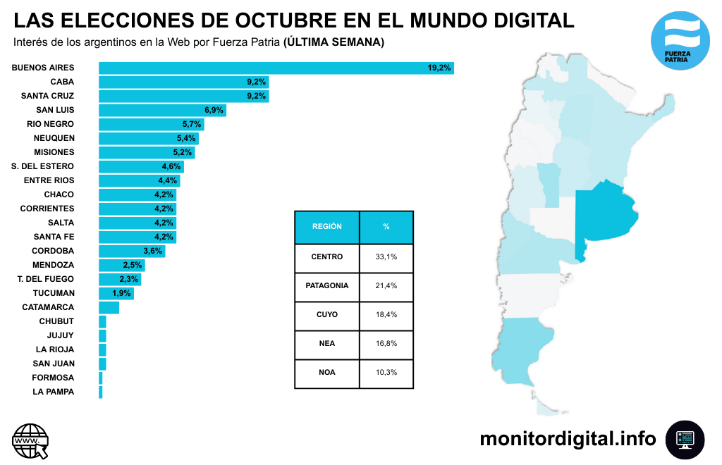 El interés digital sobre Fuerza Patria muestra una clara concentración en la Provincia de Buenos Aires (19,2%), seguida por CABA y Santa Cruz (9,2% cada una).