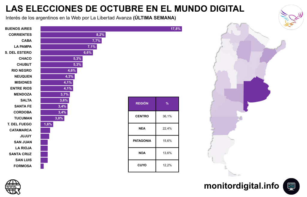 Regionalmente, el Centro aporta el 36,1% del interés, seguido por el NEA (22,4%), donde LLA se proyecta con fuerza.