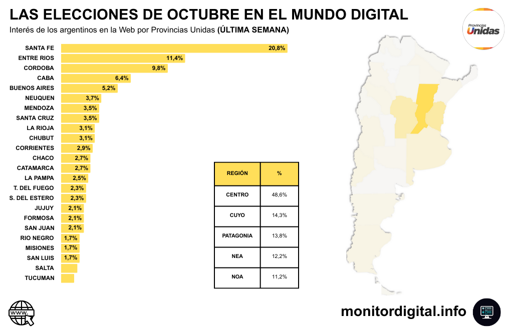 El análisis de las métricas de búsqueda en la web revela anclajes diferenciados: Fuerza Patria se sostiene especialmente en la provincia de Buenos Aires, la Alianza Libertad Avanza diversifica en el centro y el noreste del país, mientras Provincias Unidas construye su perfil en el litoral.