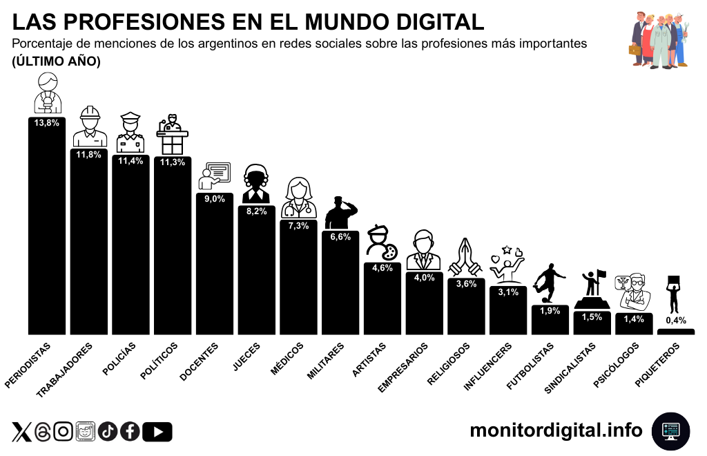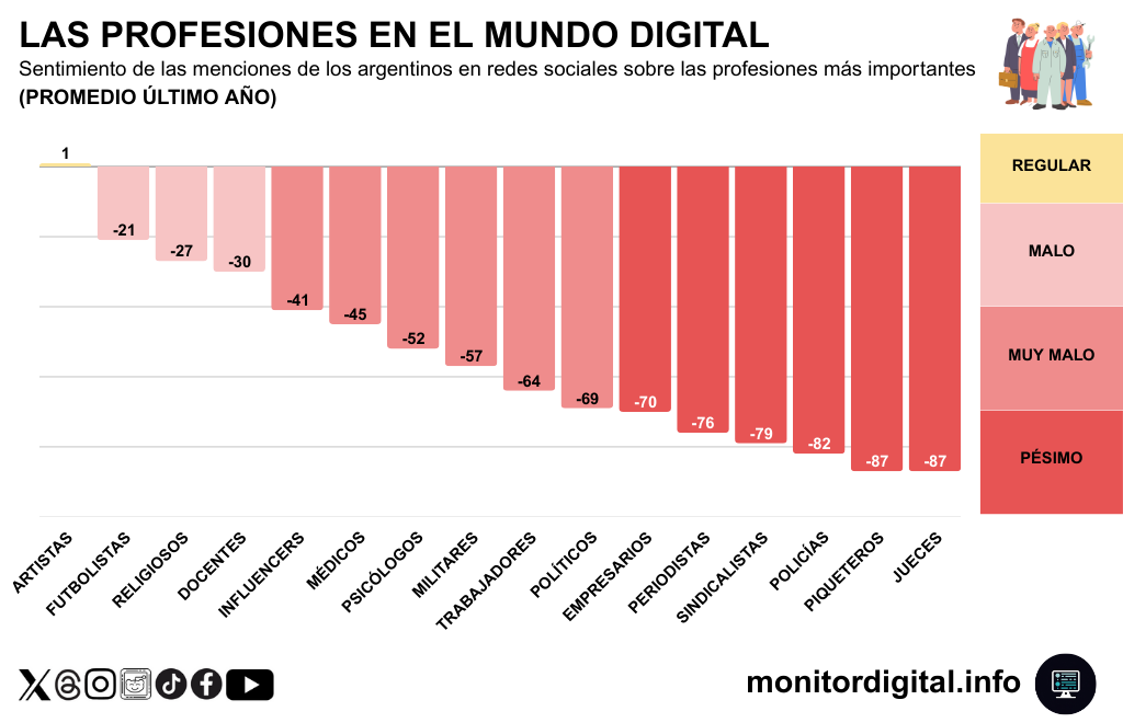 En el último año, las redes argentinas hablaron de profesiones con una lógica brutal: visibilidad alta para quienes ordenaron (o desordenaron) la calle y la política, y sentimiento mayormente negativo para casi todos.