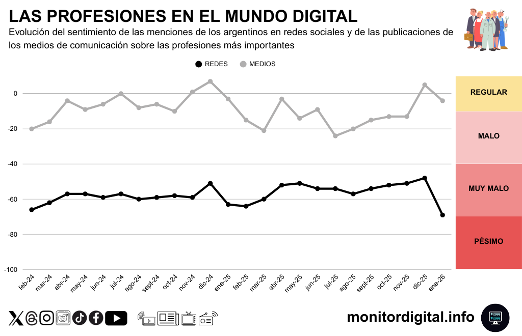 En redes, el sentimiento por las principales profesiones de los argentinos osciló alrededor de valores muy negativos y pegó un golpe fuerte en ene-26.