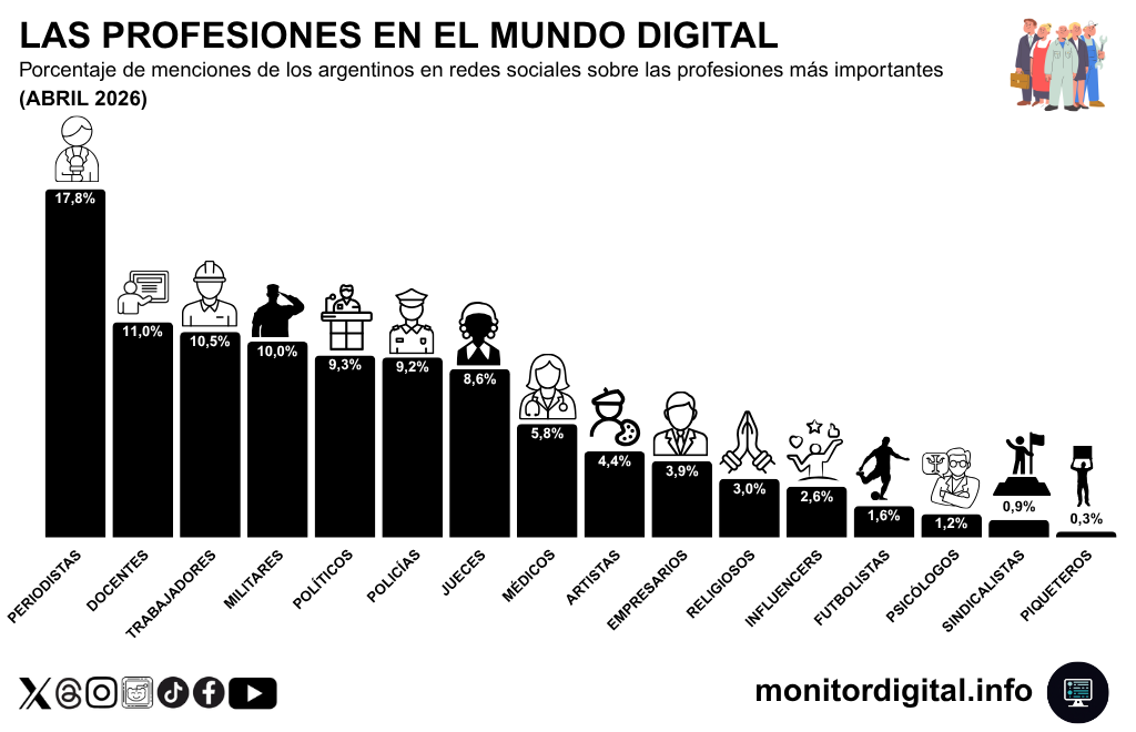 Abril revela un dato contundente sobre el rol del periodismo como profesión para los argentinos: los periodistas concentran el 17,8% de las menciones sobre profesiones, por encima de docentes, trabajadores, militares y políticos.