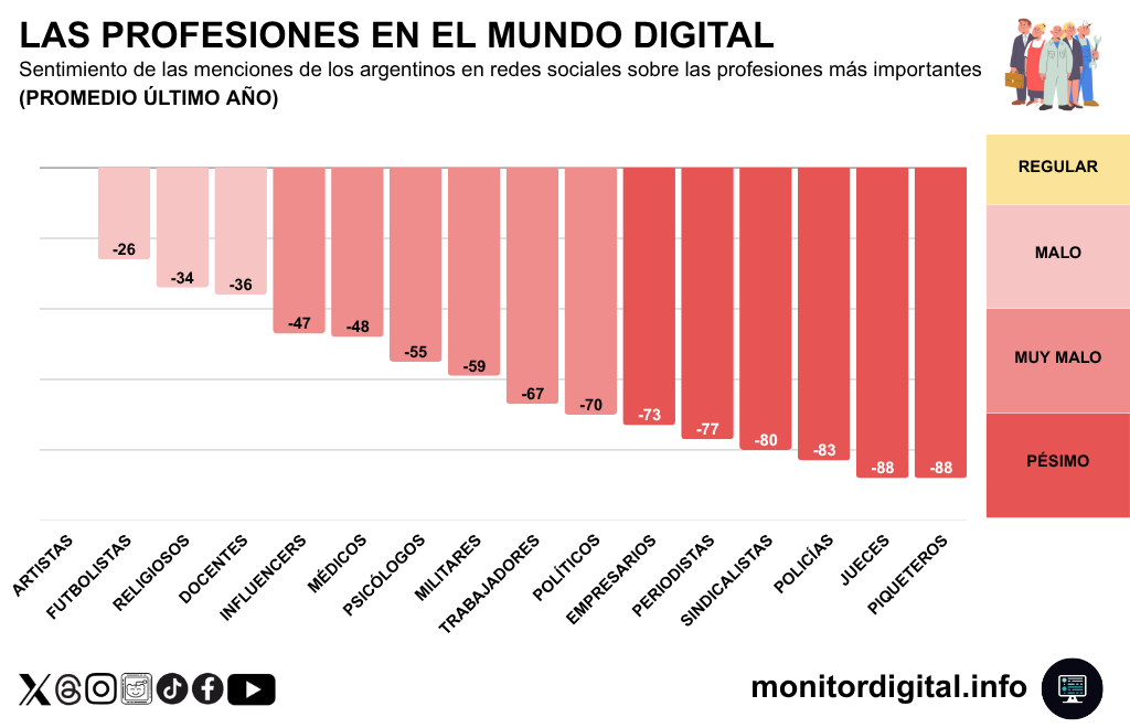Finalmente, el promedio de sentimiento del último año sobre los periodistas registra -77 puntos NSR, ubicándose entre las profesiones con peor saldo emocional del ranking.