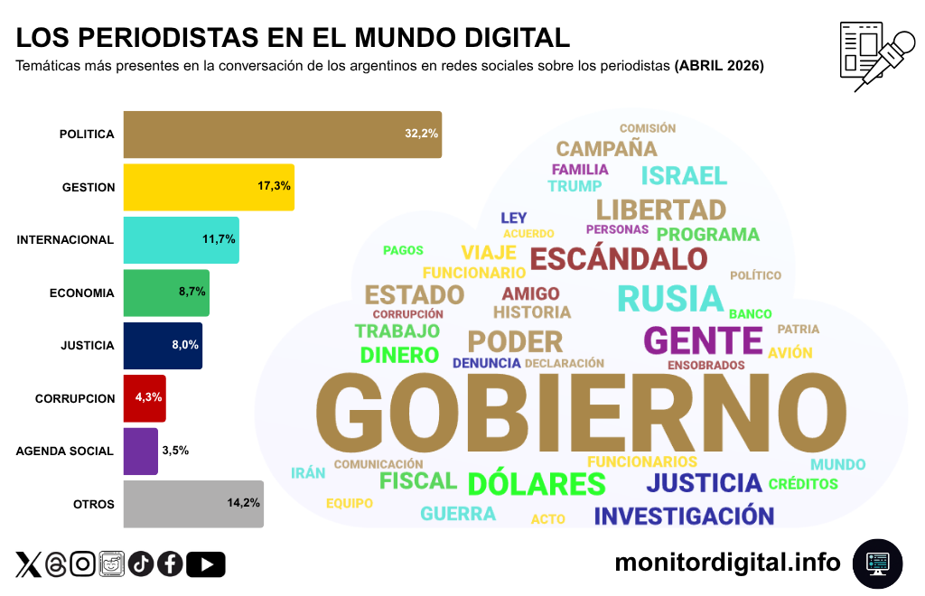 Lo político, la gestión, la agenda internacional y la Justicia dominan la conversación sobre periodistas, una charla que se desplegó aceleradamente gracias a la difusión de la presunta red rusa de desinformación en medios locales y a la reacción posterior del oficialismo.
