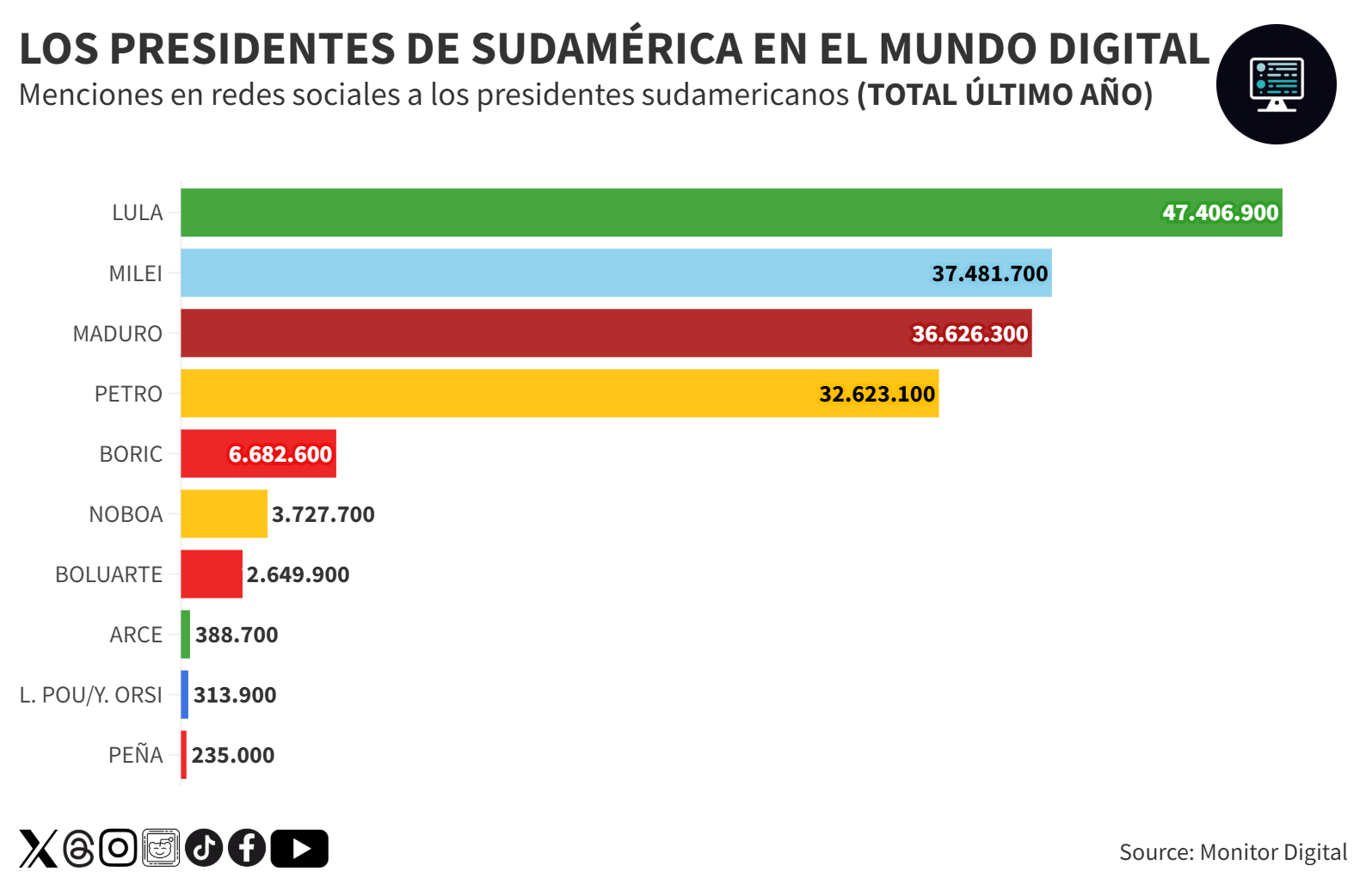 En el caso de Lula y Maduro, ambos generan conversación digital por políticas sociales, polémicas internas y sus posturas ideológicas, con un apoyo decisivo de la militancia online que también influye en este volumen.