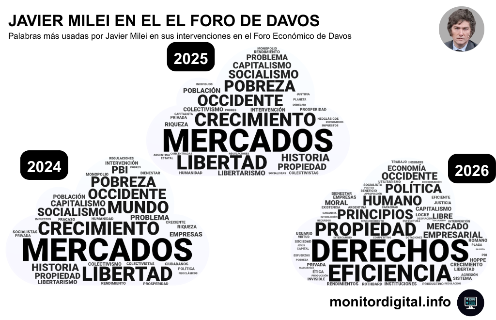Entre 2024 y 2026, Javier Milei usó el Foro Económico de Davos como una vidriera para reordenar su relato sin cambiar su marca política de origen: “libertad”.