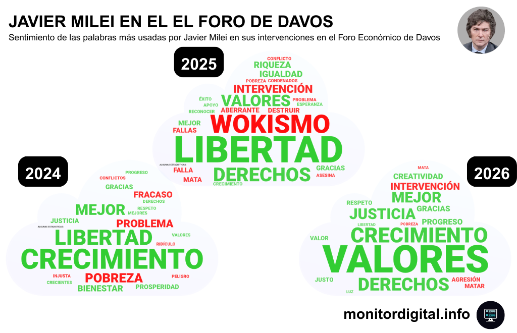 El tono de las palabras del año pasado en Davos se volvió más polarizante. “Libertad” y “derechos” traccionaron la positividad, mientras “wokismo” y “intervención” concentraron negatividad y confrontación. El discurso de Milei ganaría mayor "filo": menos pedagogía económica, más batalla cultural (con riesgo de que el mensaje se comiera al mensajero, como finalmente terminó sucediendo).
