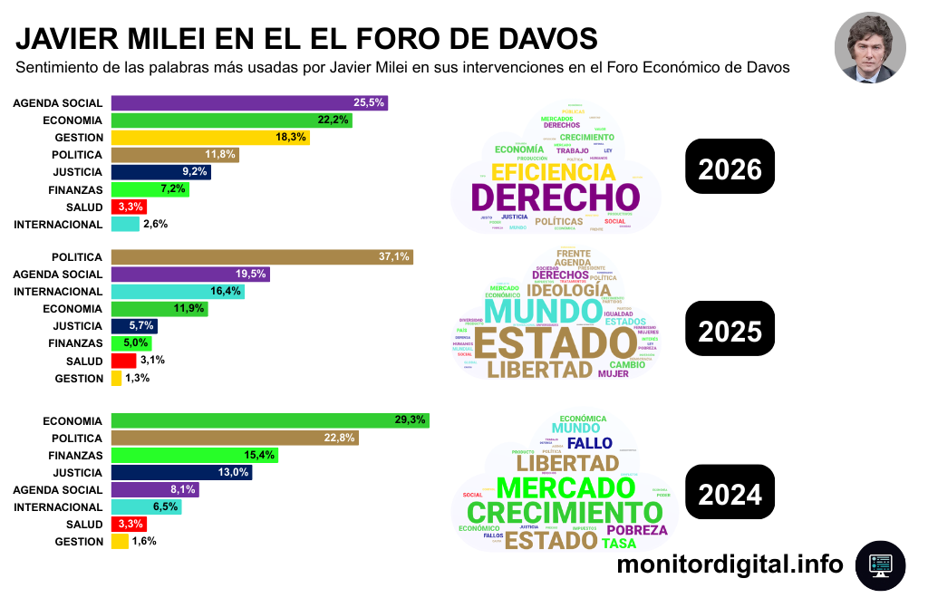 La prioridad del reciente discurso del mandatario argentino ante el Foro Económico de Davos la encabezó Agenda social (25,5), con Economía (22,2) y Gestión (18,3) como soporte operativo del planteo. Política (11,8) y Justicia (9,2) sostuvieron la estructura conceptual. Finanzas (7,2) e Internacional (2,6) quedaron al margen del protagonismo.