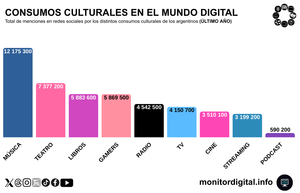 En los últimos años, la conversación cultural de los argentinos se ordenó con una jerarquía nítida: la música sostuvo el liderazgo como “lengua franca” del consumo, mientras teatro y el mundo gamer ganaron terreno por tendencia y por ir construyendo comunidades cada vez más fuertes.