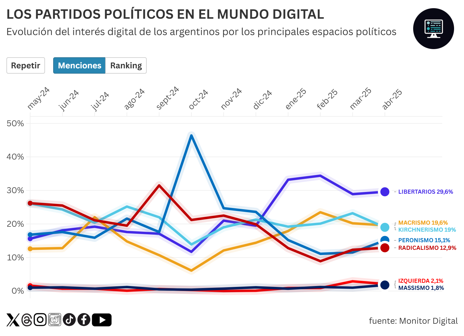 Luego de ese pico, el actual oficialismo bajó en abril de 2024 al 29,6 % de la charla político-digital, aunque siguen liderando la conversación.