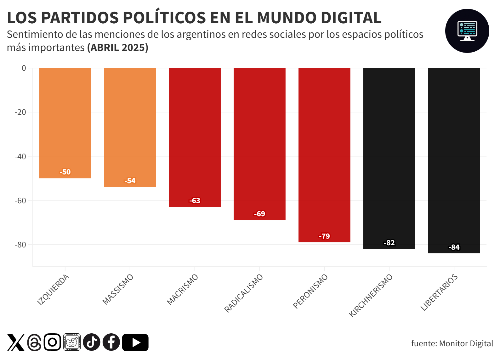 Apenas un escalón mejor (pero un escalón muy bajo) queda el kirchnerismo con -82 puntos de promedio de sentimiento.