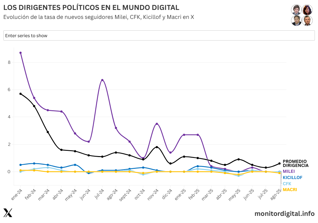 - Kicillof: muestra picos interesantes en 2025 (junio, casi 3%), lo que lo coloca por momentos por encima del promedio. Es la única figura del peronismo que muestra reactivación en esta red.