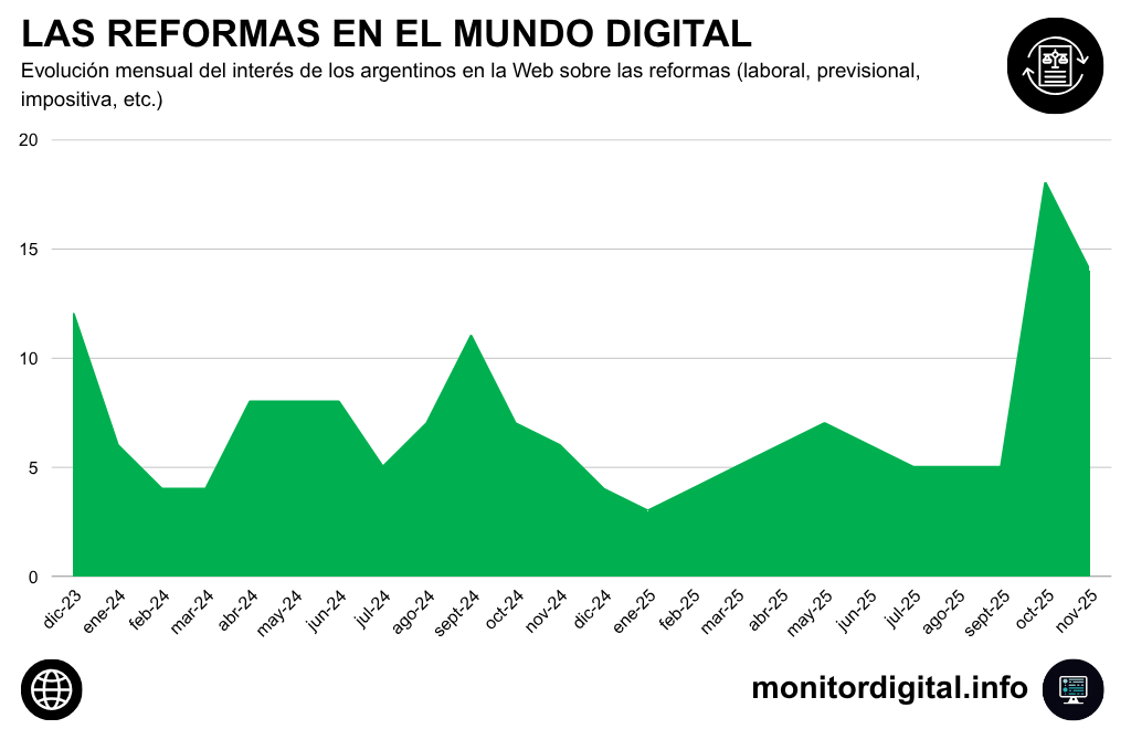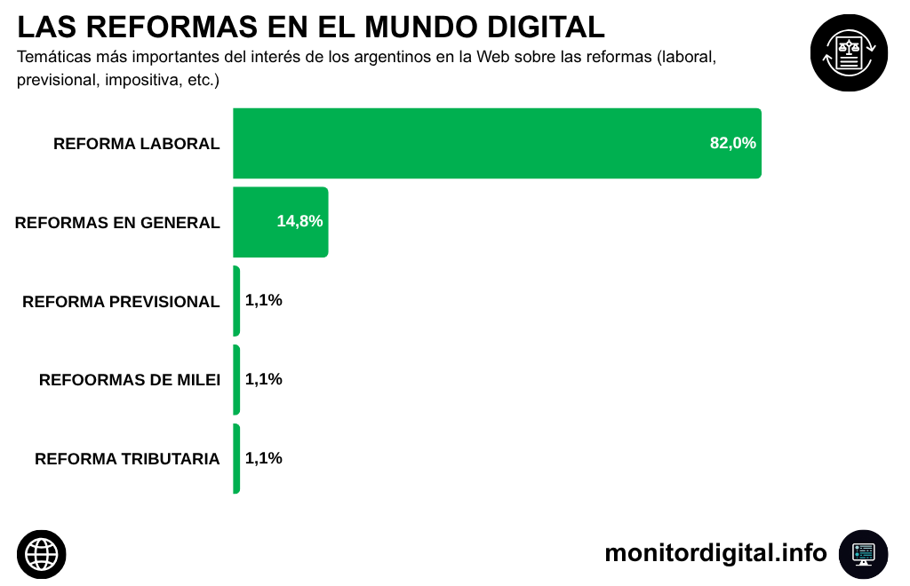 La placa temática elaborada por Monitor Digital que analiza las consultas de los argentinos en Google sobre las reformas es contundente: el 82% del interés se concentra en la reforma laboral.
