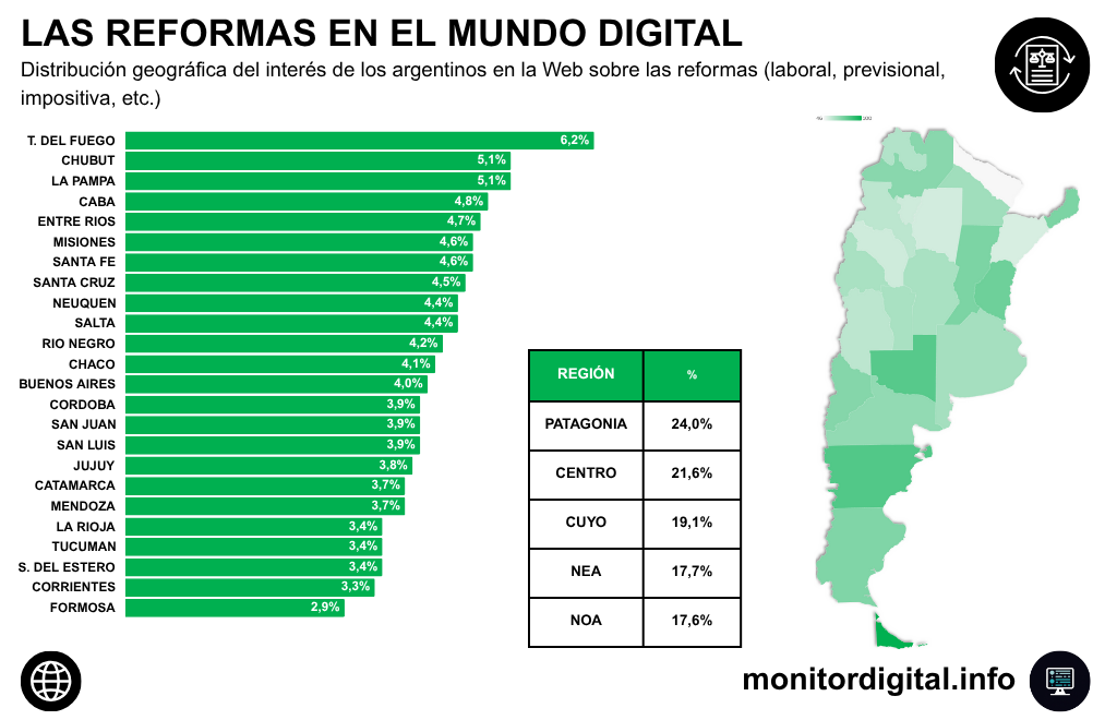 El interés digital de los argentinos por las reformas tiene una distribución pareja desde el análisis de la geolocalización de los usuarios que buscan información al respecto, pero con una tendencia clara: la Patagonia lidera con el 24% de las consultas online.