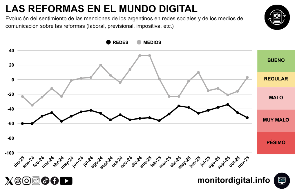 Si miramos en perspectiva los últimos dos años de evolución del sentimiento digital en redes y medios argentinos sobre los distintos tipos de reformas, observamos mejoras progresivas en la prensa hasta inicios de 2025, con una evolución lenta, pero favorable en las redes sociales, sólo interrumpida en los últimos 60 días.
