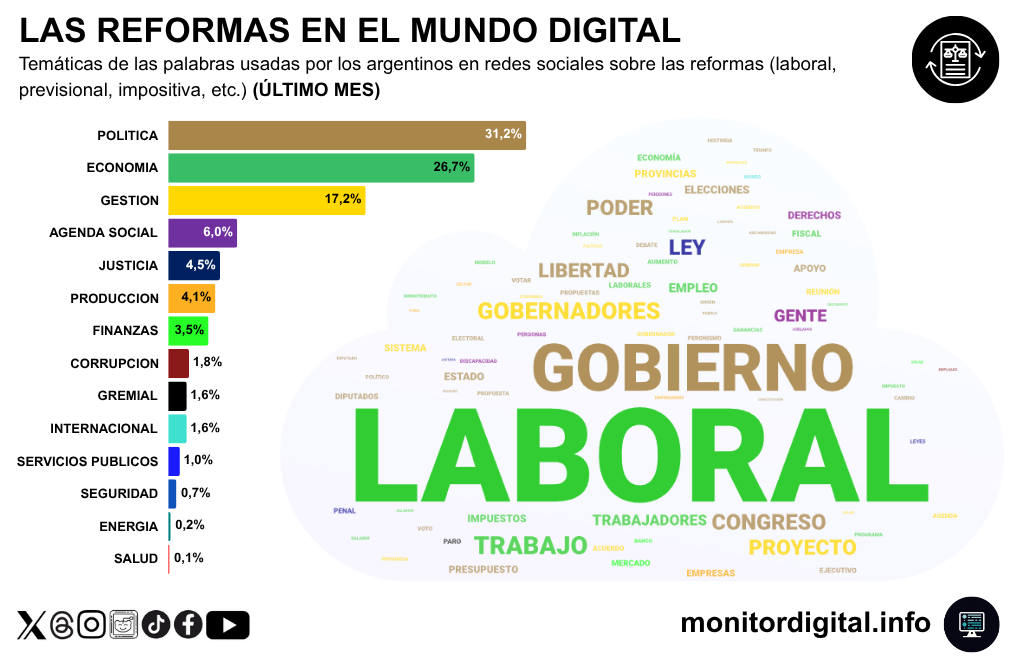 La distribución temática que surge de la conversación de los argentinos en redes sociales muestra un dato clave: la política absorbe el 31,2% de la conversación sobre las reformas.