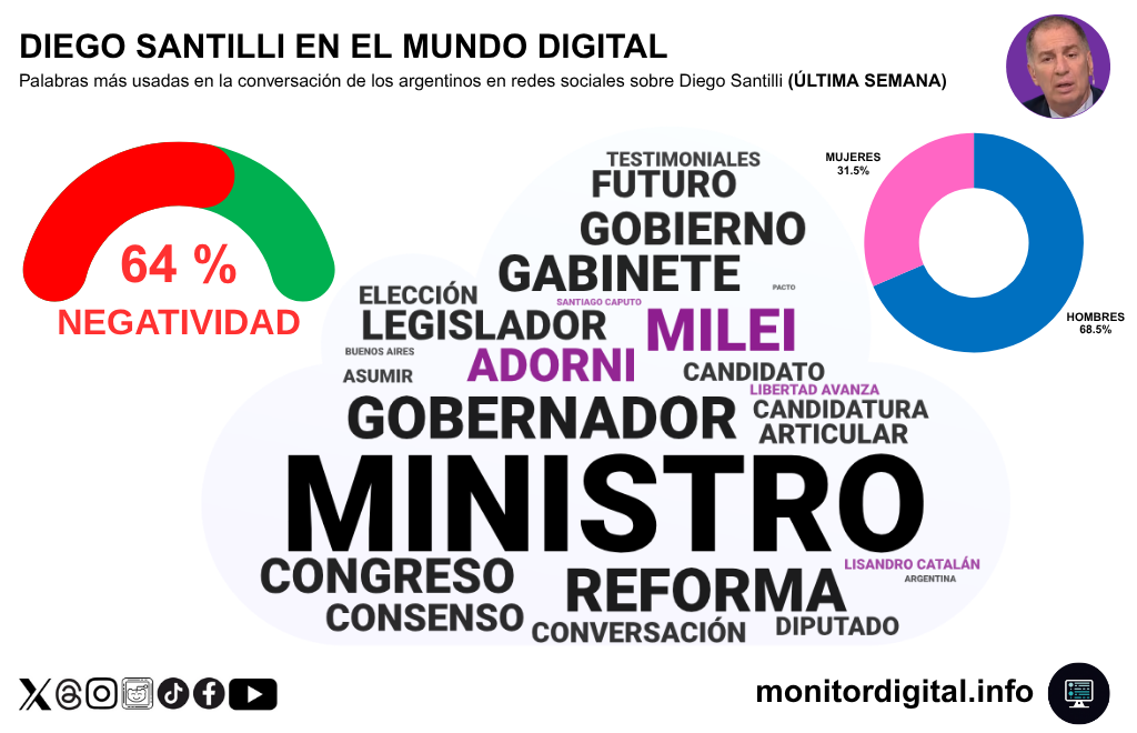 Durante la última semana, la conversación digital sobre Santilli registró un 64% de negatividad, un nivel más moderado que el del resto del gabinete, pero igualmente alto en términos de desgaste político.