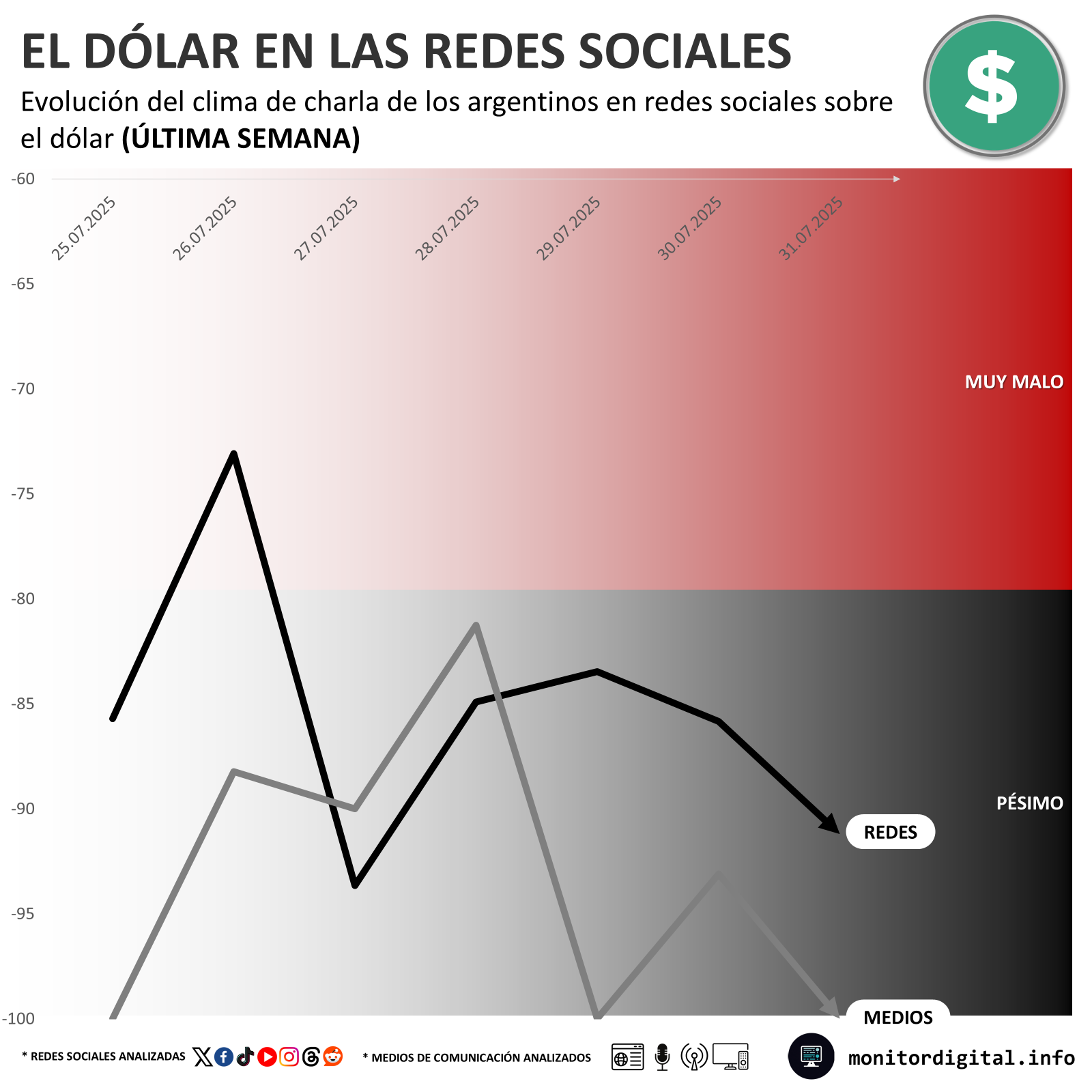 En cuando al sentimiento de las menciones sobre el dólar, el clima no hizo más de que negativizarse a valores altísimos.