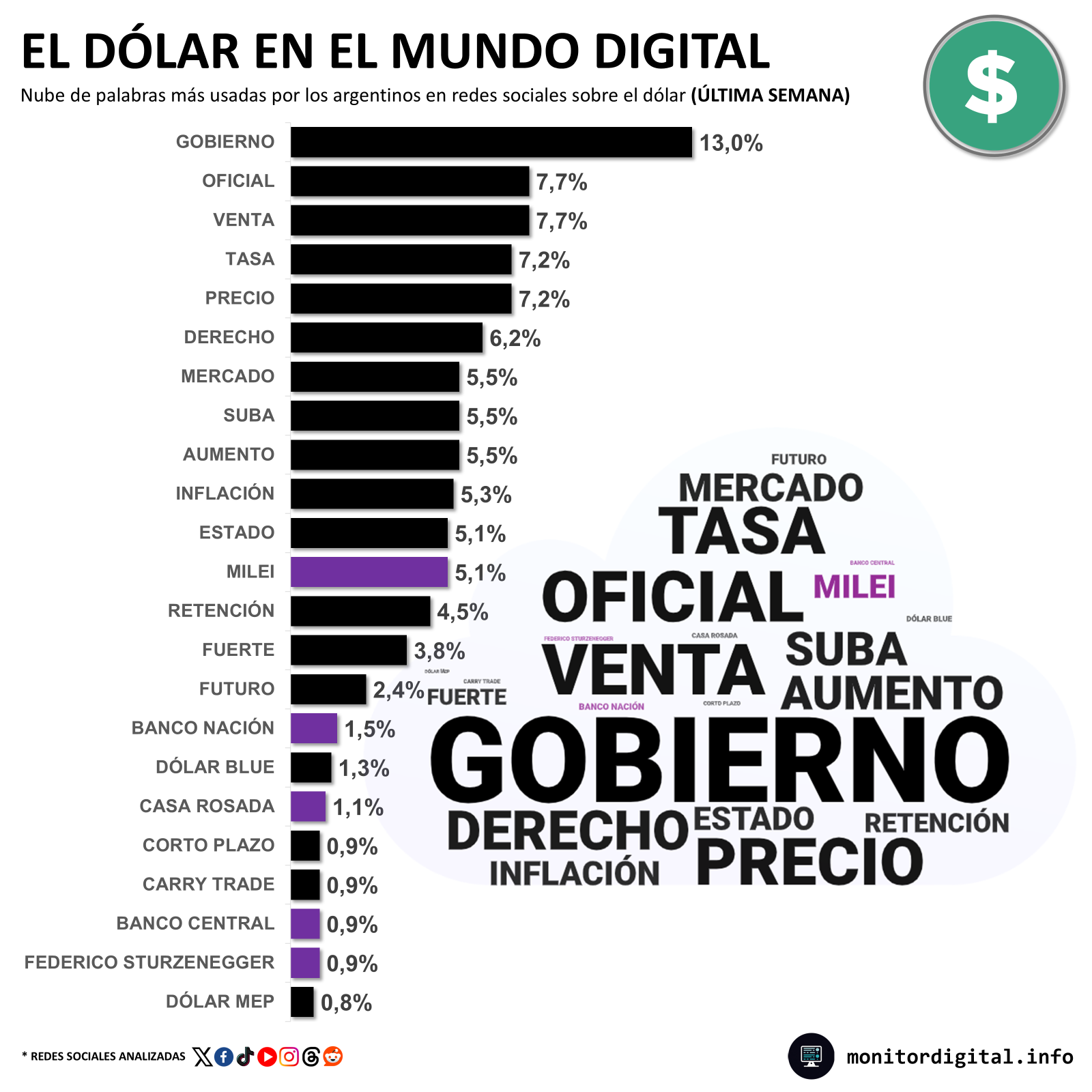 Los hashtags #DólarHoy, #Dolarización y #Inflación se posicionaron entre los temas más comentados en la Argentina durante la jornada.