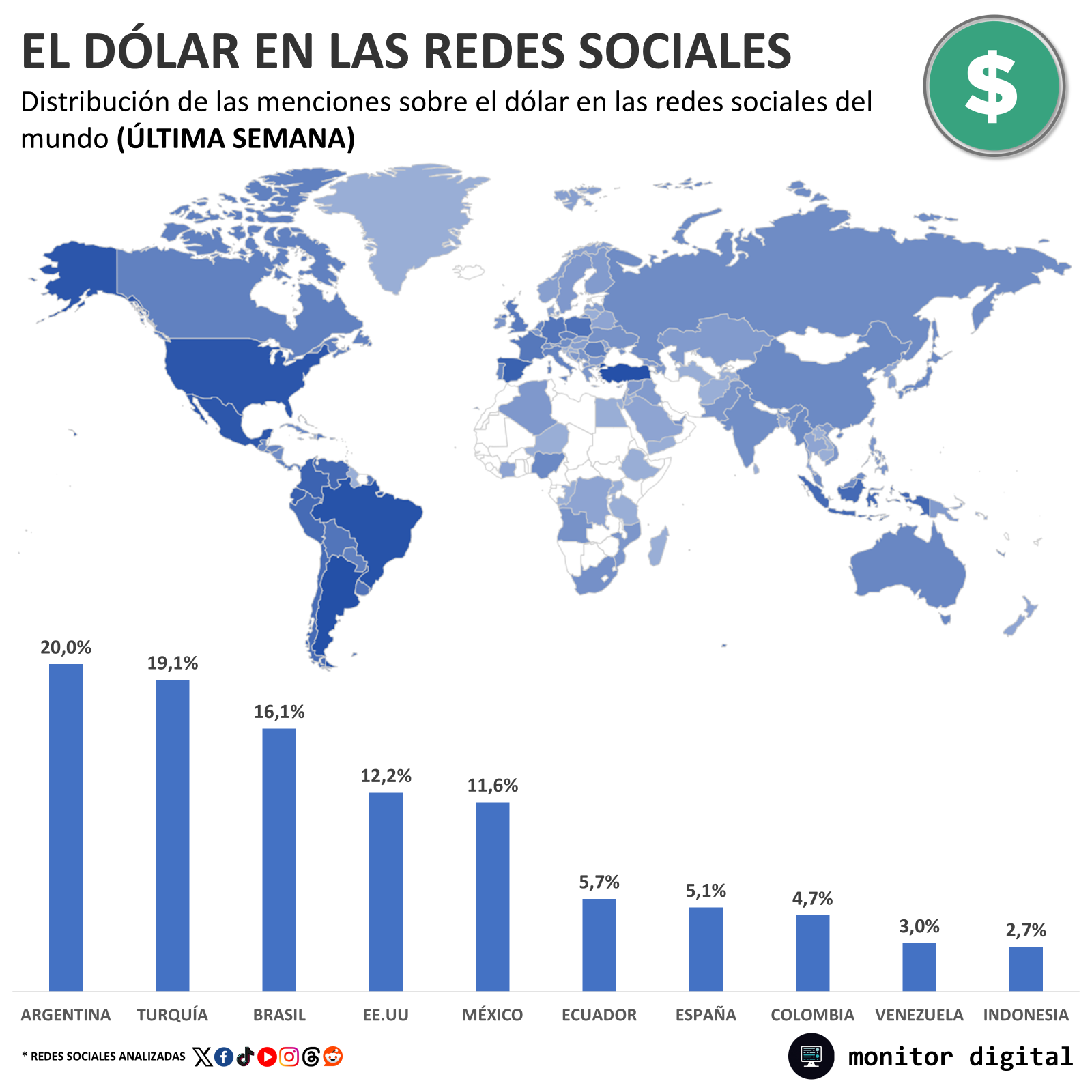 Analizando las menciones globales en redes sociales sobre el dólar, la Argentina se impone con el porcentaje mayor.