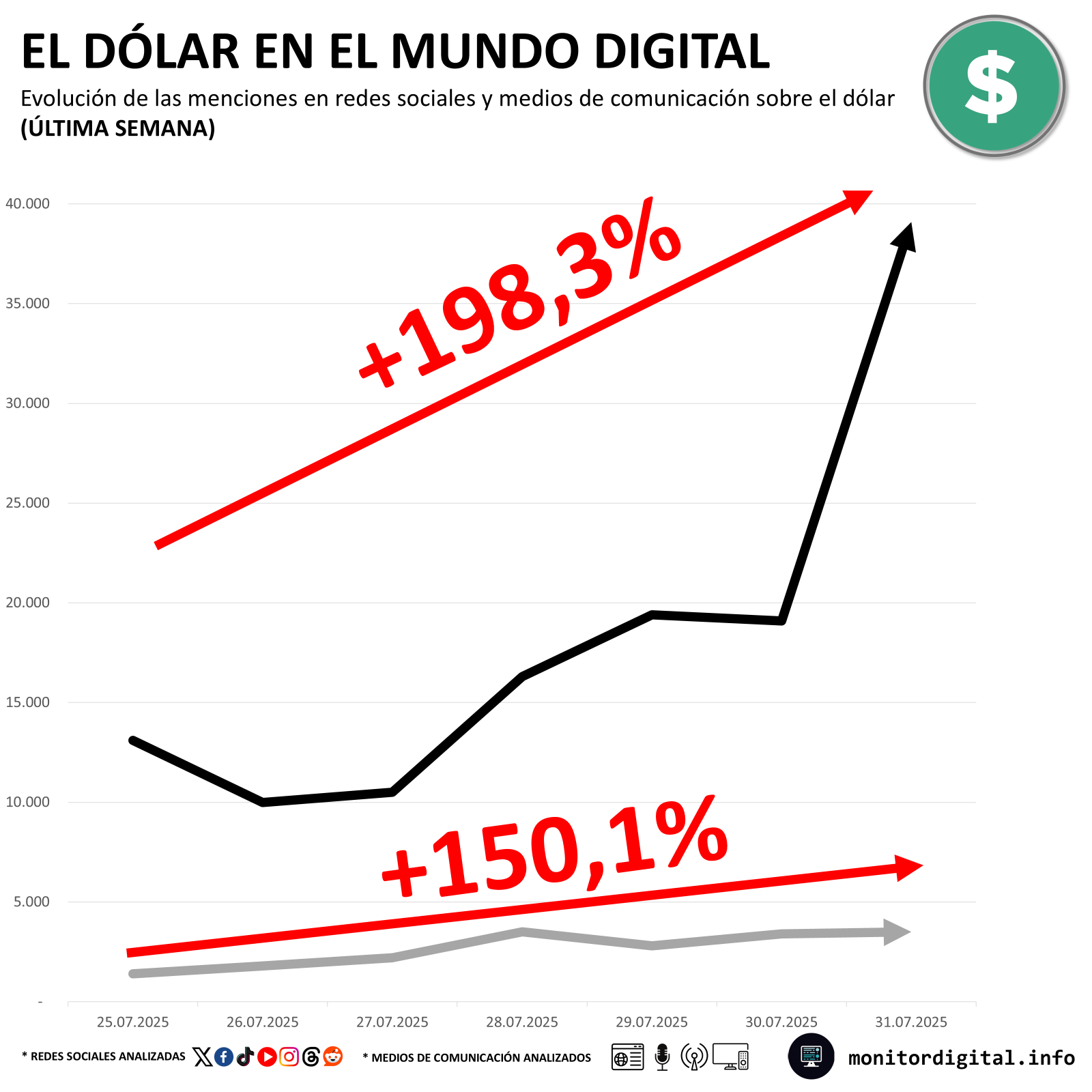 En una semana, la conversación sobre el dólar saltó casi un 200% en redes sociales, con un incremento del 150% en publicaciones periodísticas.