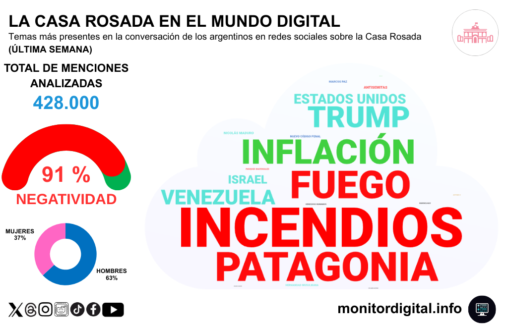 La conversación en redes sobre la Casa Rosada sumó 428.000 menciones en la última semana y se estructuró alrededor de un eje dominante: INCENDIOS / PATAGONIA / FUEGO.