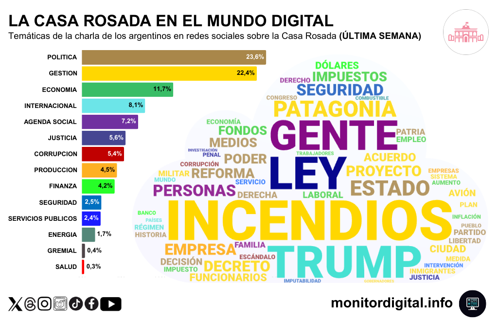 La nube temático-discursiva que refleja la última semana de debate en redes sobre la Casa Rosada reforzó una escena de “Estado en acción” y “Estado en falta” al mismo tiempo: ley, proyecto, decreto, impuestos convivieron con incendios y con la idea de “gente” como sujeto moral que evalúa la gestión.
