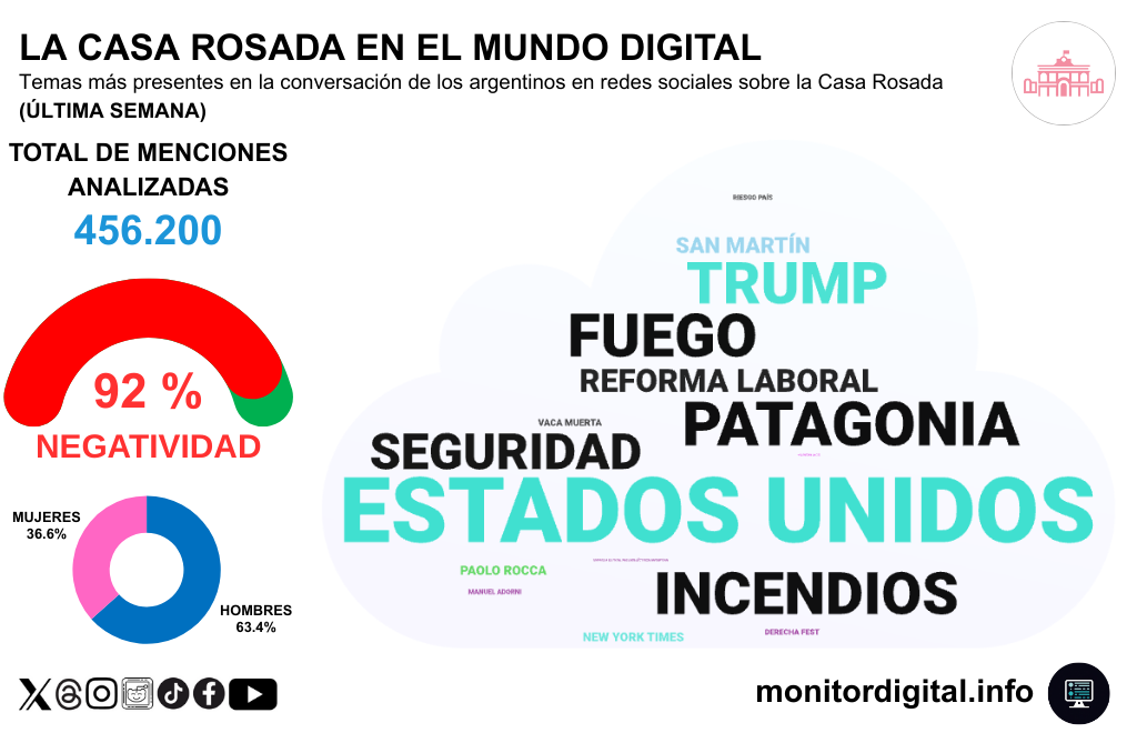 El clima digital quedó dominado por una negatividad extrema (92%), con una conversación más masculina (63,4%) que femenina (36,6%).