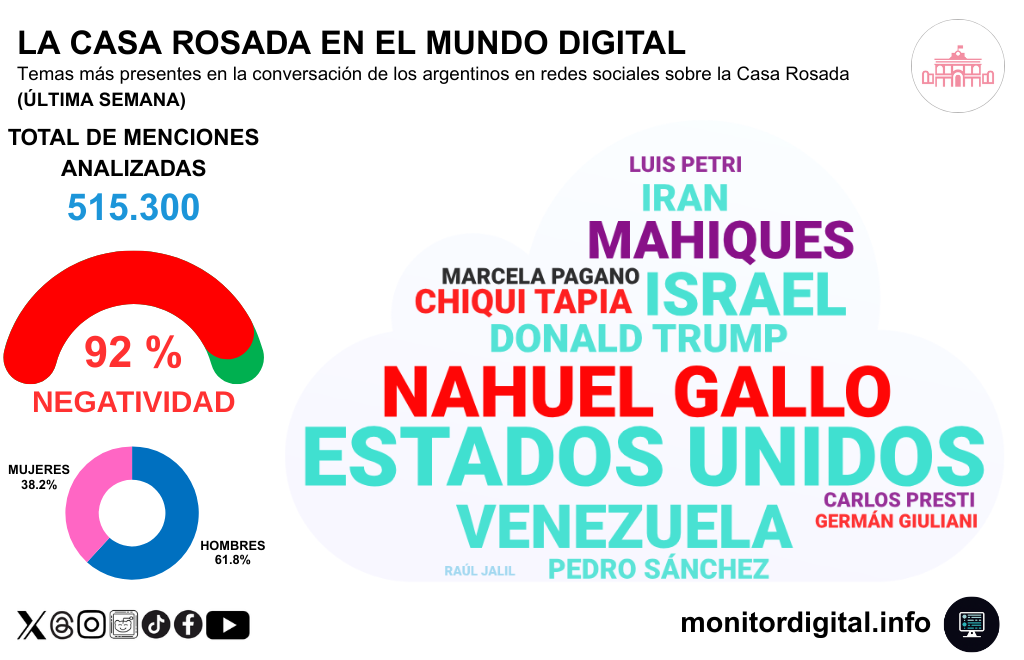 La conversación sobre Casa Rosada sumó 515.300 menciones con 92% de negatividad, mientras la de Javier Milei llegó a 1.101.200 menciones con 81% de negatividad.